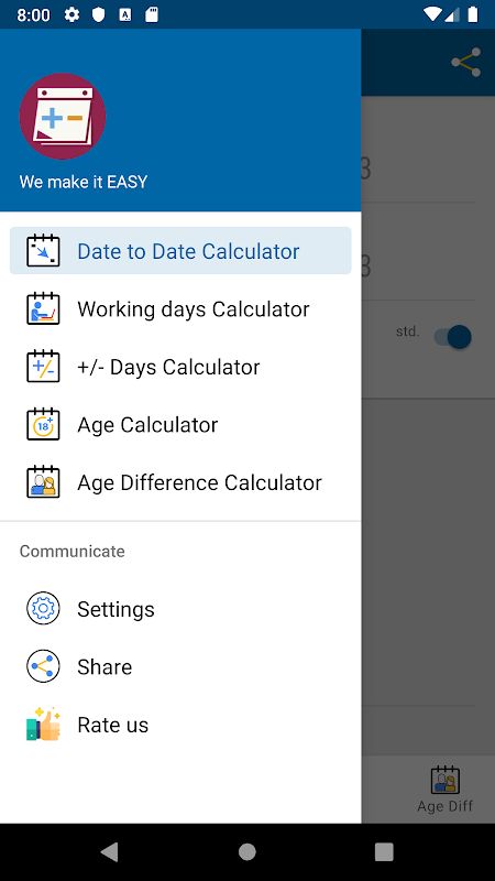 استفاده از برنامه "Date Calculator" با یک رابط کاربری ساده و کنترل های حالت لمسی بصری بسیار آسان است ، همچنین تم تاریک و تم روشن برای انتخاب دارند. با استفاده از ماشین حساب تاریخ در دستگاه خود ، می توانید به راحتی با خرما بازی کنید. دو تاریخ را اضافه کنید ، کم کنید یا تعداد روزها را به تاریخ اضافه کنید ، این برنامه از انواع محاسبات مربوط به تاریخ پشتیبانی می کند. مطمئناً از دیدن نتایج دقیق شگفت زده خواهید شد. این برنامه برای فعالیت های روزمره زندگی در دفتر ، کارهای مسکن یا مدارس بسیار مفید است. به سرعت تعداد روزهای کاری باقی مانده یا تعداد روزهای کاری بین دو تاریخ را پیدا کنید! همه آن فقط با یک کلیک.