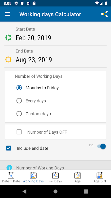 آیا در محاسبه تعداد روزهای کاری یا تعداد روزهای بین دو روز مشکل دارید؟ وقت آن است که با برنامه "Date Calculator" ساده تر این محاسبه را انجام دهیم ، حتی بیشتر. فقط با یک کلیک می توانید تفاوت بین تاریخ ها را محاسبه کنید یا تعداد روزهای کاری را محاسبه کنید. این برنامه بسیار مفید است و در تخمین برنامه های شما به شما کمک می کند. همچنین می توانید تفاوت دقیق را دقیقاً تا چند دقیقه محاسبه کنید. "ماشین حساب تاریخ" فقط با تاریخ بسیار جذاب است.