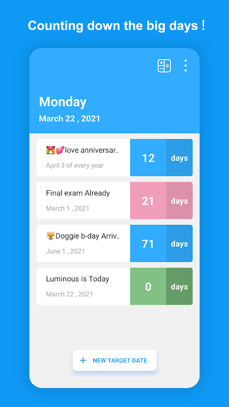 تعداد روزهای روزهای بزرگ مانند تولد، سالگرد عشق، روز پرداخت را روی صفحه نمایش شما نمایش می دهد تا روزهای بزرگ را از دست ندهید!