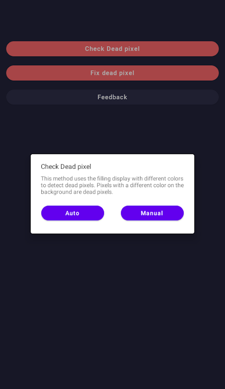 این برنامه تمام صفحه را در یک زمان با یک رنگ پر می کند. علاوه بر این، رنگ صفحه نمایش را تغییر می دهد. اکنون با مشاهده صفحه نمایش، کاربران می توانند پیکسل های مرده برجسته شده روی رنگی متفاوت از رنگ کل صفحه را تشخیص دهند.