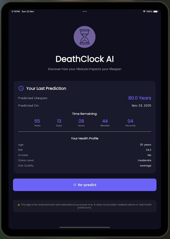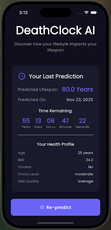 DeathClock AI همراه هوشمند و مجهز به هوش مصنوعی شما در زمینه سلامت است که به شما کمک میکند تا کشف کنید که چگونه انتخابهای سبک زندگیتان ممکن است بر طول عمر شما تأثیر بگذارد. این برنامه با استفاده از تجزیه و تحلیل پیشرفته سلامت و مدلهای یادگیری ماشینی، طول عمر تخمینی را به همراه نکات بهداشتی شخصیسازی شده به شما ارائه میدهد تا به شما در زندگی بهتر، طولانیتر و سالمتر کمک کند.