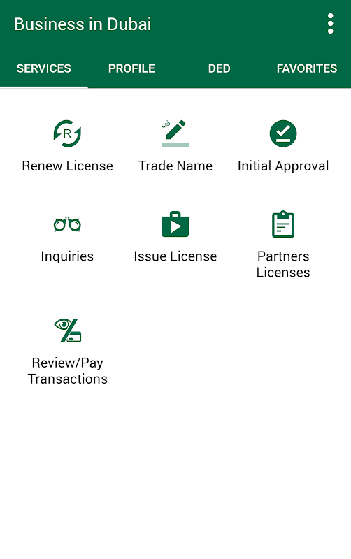 Various eServices on the app enables users to Reserve/Renew a trade name, obtain an Initial Approval to start a new business, Renew an existing trade license and check the transaction status.