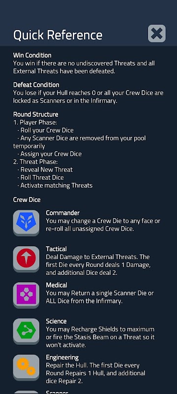 این برنامه یک اقتباس دیجیتالی غیر رسمی ساخته شده توسط طرفداران Deep Space D-6 است ، یک بازی روی میز یک نفره فوق العاده توسط Tau Leader Games. شما کاپیتان یک سفینه فضایی در اعماق قلمرو دشمن هستید و باید از خدمه خود به بهترین نحو استفاده کنید. شما تاس می ریزید که نماینده خدمه شما است و آنها را به ایستگاه های مختلف اختصاص می دهید تا با تهدیدهای خارجی و داخلی ورودی مقابله کنند. آیا از علم خود برای شارژ سپرها یا برطرف کردن پیچ و تاب زمان استفاده خواهید کرد؟ آیا مهندسان خود را برای مقابله با قیام ربات ها یا تعمیر بدنه شما می فرستید؟ آیا خدمه خود را به پیروزی می رسانید یا در خلا سرد فضا با عذاب خود روبرو می شوید؟