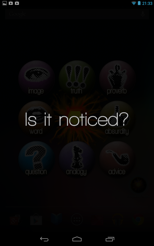 ► Usage is very easy: Simply open the app and choose amongst eight categories of answers: absurdity, advice, analogy, image, proverb, question, truth and word.