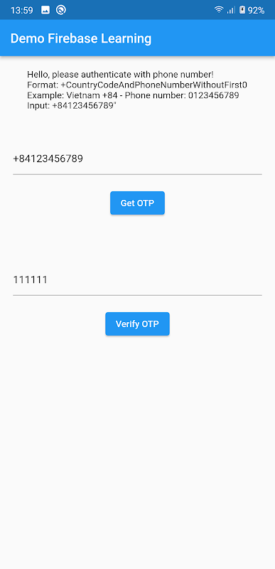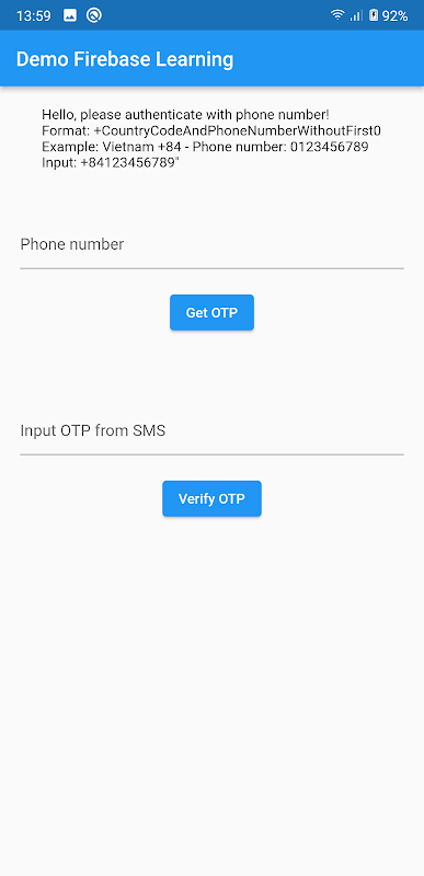 برای یادگیری یک دمو Firebase انجام دهید. از احراز هویت تلفن Firebase برای تأیید کاربر استفاده کنید. در صورت موفقیت آمیز بودن تأیید، کاربر به صفحه اصلی هدایت می شود.