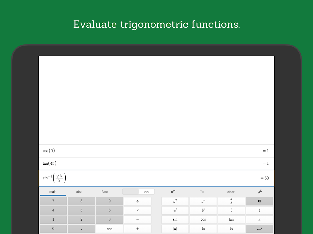 مثلثات: ارزیابی توابع مثلثاتی اساسی و معکوس آنها، با استفاده از رادیان یا درجه برای اندازه زاویه.