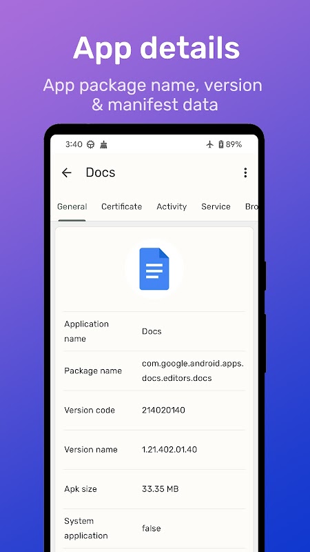 صفحه برنامه ها همه برنامه های کاربر و برنامه های سیستم را فهرست می کند. صفحه جزئیات برنامه نسخه برنامه، حداقل سیستم عامل، سیستم عامل هدف، تاریخ نصب، تاریخ بهروزرسانی، مجوزها، فعالیتها، خدمات، ارائهدهندگان، گیرندهها و غیره را نشان میدهد و میتوانید فایلهای apk را در اینجا صادر کنید.