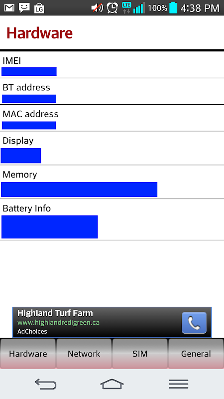 HW: IMEI, Bluetooth Address, MAC Address, Display, Memory (ROM and RAM), Battery Info