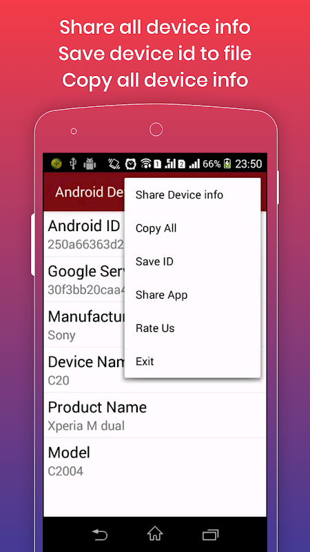 با استفاده از این برنامه به راحتی می توانید شناسه دستگاه یا شناسه آندروید خود را مشاهده کنید. می توانید شناسه دستگاه خود را پشتیبان تهیه کنید و آن شناسه دستگاه را به عنوان پرونده ای با نام دستگاه در حافظه داخلی ذخیره کنید.