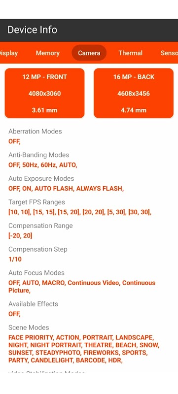 Evil Scan Device Info شامل جزئیات مربوط به CPU، RAM، سیستم عامل، حسگرها، حافظه، باتری، سیم کارت، بلوتوث، برنامه های نصب شده، برنامه های سیستم، نمایشگر، دوربین، جنبه های حرارتی، کدک ها، ورودی ها، حافظه نصب شده و زمان CPU است. در ایالت