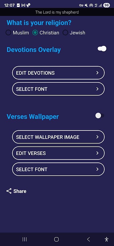 این برنامه یک تجربه صلح آمیز را از طریق عبارات عبادی شناور و نقل قول های مقدس از قرآن، انجیل و متون مقدس عبری ارائه می دهد. هر بار که تلفن شما بیدار می شود یا تصویر زمینه را نمایش می دهد، یک نقل قول جدید ظاهر می شود که دستگاه شما را به فضای بازتاب و ارتباط معنوی تبدیل می کند.
