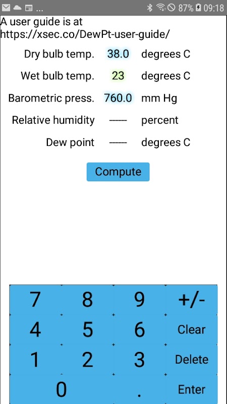 این برنامه دمای نقطه شبنم و رطوبت نسبی را از دمای لامپ مرطوب ورودی، دمای حباب خشک و فشار هوا محاسبه می کند. اگر فشارسنج در دسترس نباشد، حدس 760 میلیمتر جیوه معمولاً نتیجه تقریباً کافی میدهد. دما بر حسب درجه سانتیگراد و فشار هوا بر حسب میلی متر جیوه است.