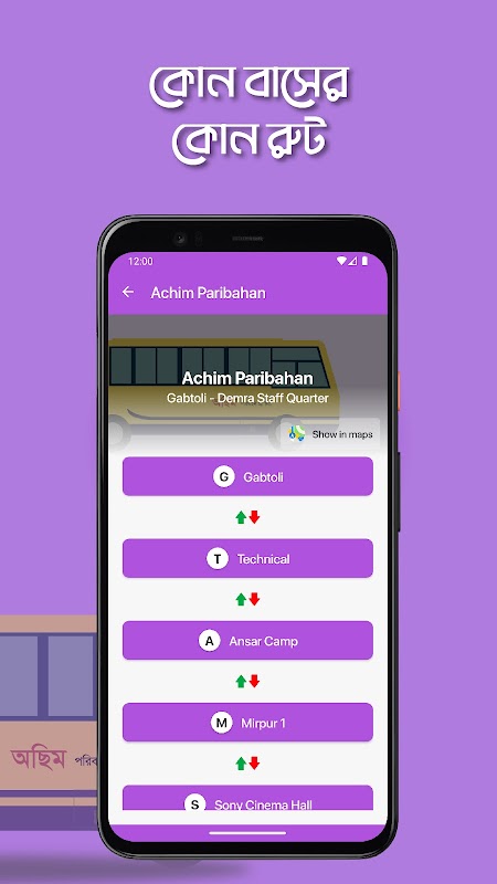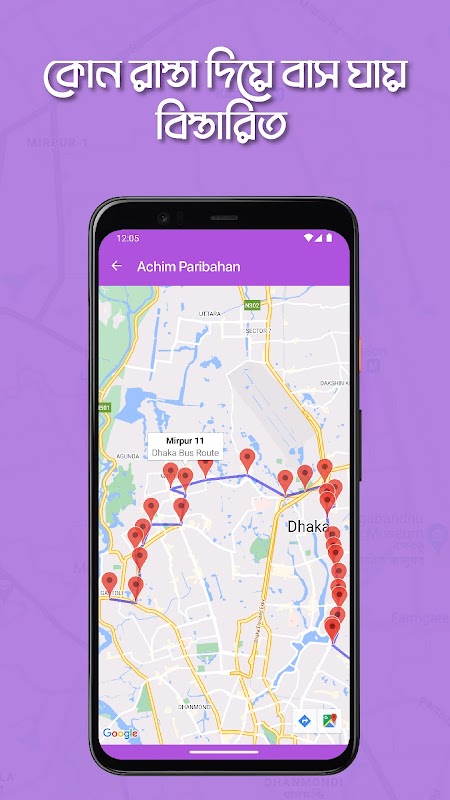 بنابراین برای صرفه جویی در وقت خود از این نوع مشکلات، برنامه ما می تواند یک راه حل عالی برای شما باشد. که از طریق آن می توانید اتوبوس خود را به راحتی پیدا کنید. اطلاعات اتوبوس تمام مسیرهای شهر داکا را می توانید با یک کلیک بدانید. شما به راحتی می توانید مکان ایستگاه اتوبوس در نزدیکی خود را پیدا کنید. همچنین با استفاده از نقشه گوگل می توانید به راحتی ببینید اتوبوس شما در کدام مسیر حرکت می کند. این به شما محل استند بعدی شما را می گوید.