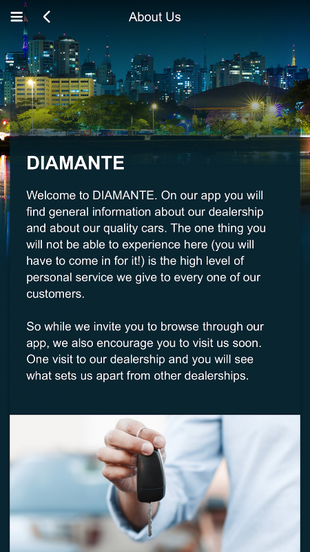 Welcome to DIAMANTE. On our app you will find general information about our dealership and about our quality cars. The one thing you will not be able to experience here (you will have to come in for it!) is the high level of personal service we give to every one of our customers.