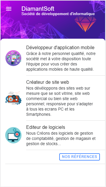 C'est une application vitrine de la société DiamantSoft câblé avec un site crée avec le CMS WordPress, cette application permet de citer les référence de la société ainsi le coordonnées.