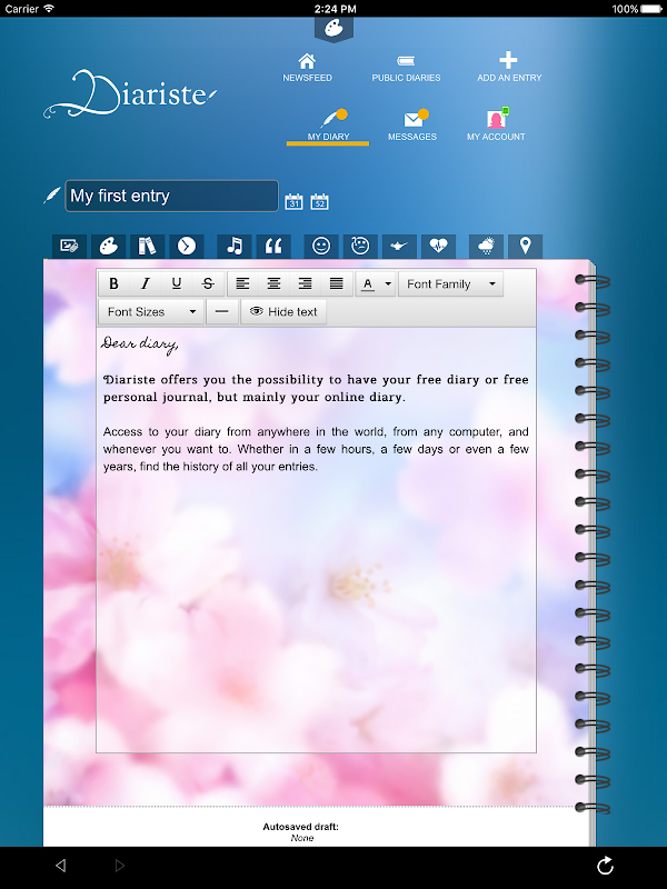 Diariste.com offers you the possibility to have your free diary or free personal journal, but mainly your online diary. Access to your diary from anywhere in the world, from any computer, and whenever you want to. Whether in a few hours, a few days or even a few years, find the history of all your writings.