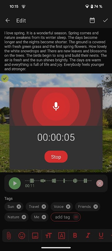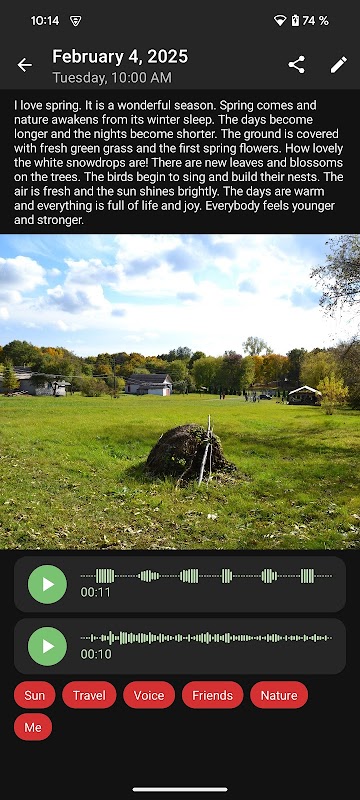 📸 افزودن یادداشتها با عکسها و فیلمها به شما این امکان را میدهد که یادداشتهای روزانه را بصریتر، از نظر احساسی غنیتر و دقیقتر کنید. و یادداشت های صوتی به ثبت بهتر لحظات کمک می کند، فضا و احساساتی را که توصیف آنها در متن ساده دشوار است، منتقل می کند. در آینده، چنین یادداشت هایی به خاطرات زنده ای تبدیل می شوند که می خواهید مرور کنید.