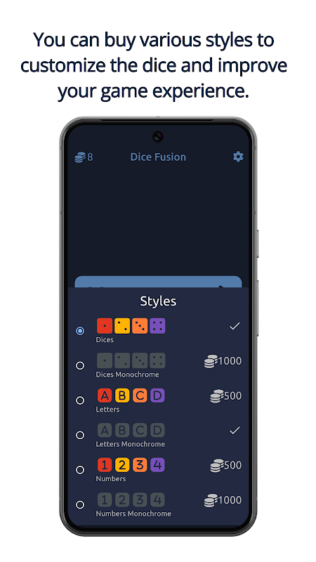 با سکه هایی که به دست می آورید، می توانید **سبک**های مختلف را خریداری کنید تا رنگ و طرح تاس ها را تغییر دهید و تجربه بازی خود را لذت بخش تر کنید.