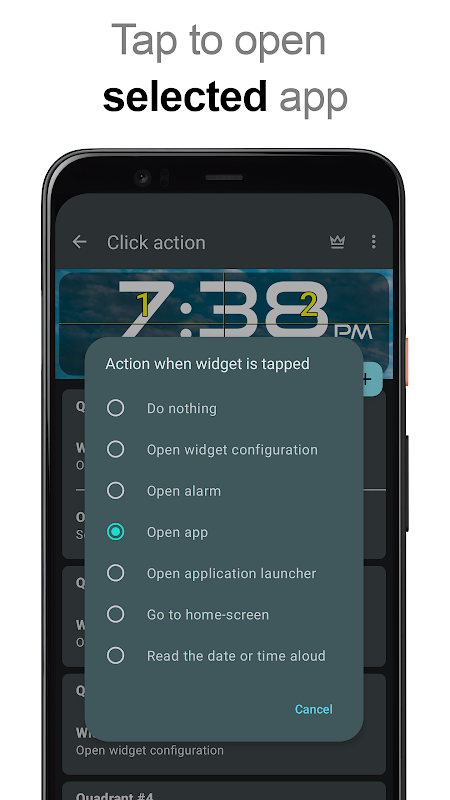 - اقدامات کلیک ویجت را انتخاب کنید: برای بارگیری برنامه هشدار ، تنظیمات ویجت یا هر برنامه نصب شده ، روی ویجت ضربه بزنید