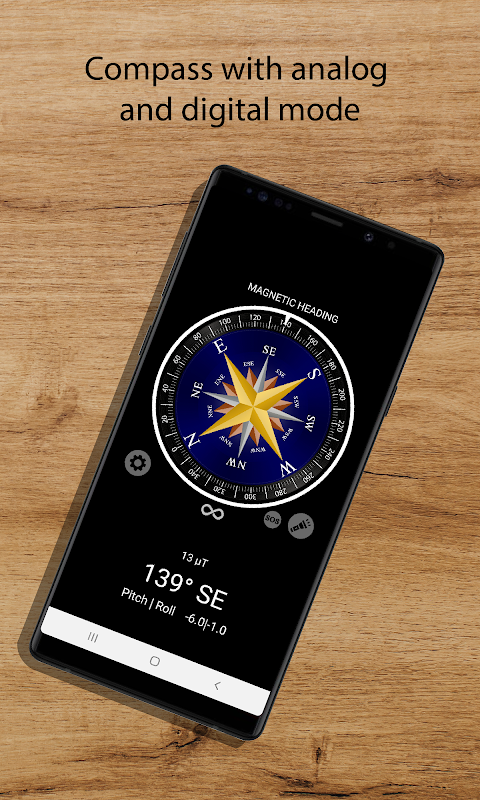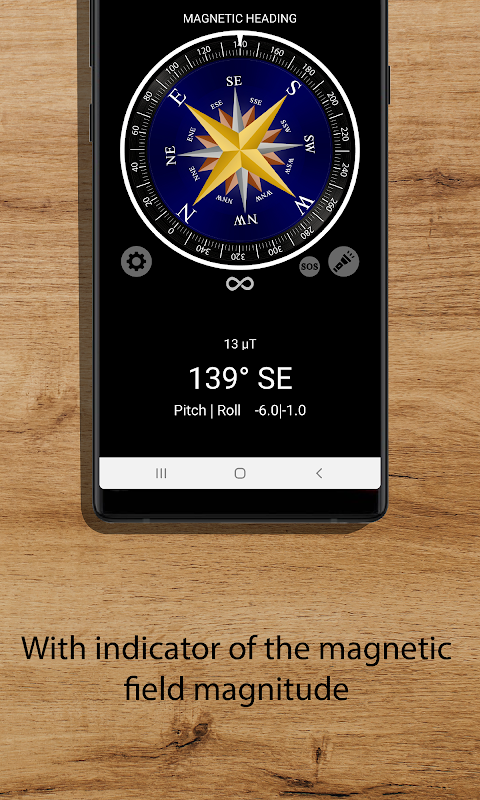این برنامه با استفاده از حسگرهای میدان مغناطیسی و شتاب سنج، عنوان مغناطیسی را به کاربر نشان می دهد. همچنین پارامتر pitch and roll را به کاربر نشان می دهد تا گوشی هوشمند کافی را برای یافتن جهت صحیح تنظیم کند. هنگامی که گوشی هوشمند در موقعیت افقی قرار می گیرد و در پایین صفحه نمایش داده می شود، این پارامترها به رنگ سبز تغییر می کنند. جهت گیری قطب نما آنالوگ شبیه سازی شده نمایش داده می شود. علاوه بر این، برنامه دارای عملکرد چراغ قوه است که می تواند برای ارسال سیگنال SOS پیکربندی شود. برای اینکه قطب نما به درستی کار کند، دستگاه شما باید دارای حسگرهای شتاب سنج و ژیروسکوپ باشد.