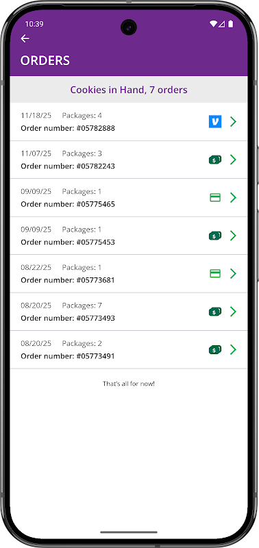 از این اپلیکیشن برای فروش کوکیهای دختران پیشاهنگ روی تلفن یا تبلت خود استفاده کنید. به راحتی میتوان به مشتریان کمک کرد تا سفارش دهند، با کارت اعتباری، ونمو یا پیپال پرداخت کنند و انتخاب کنند که کوکیهایشان به دستشان برسد، تحویل داده شود یا مستقیماً به خانهشان ارسال شود!