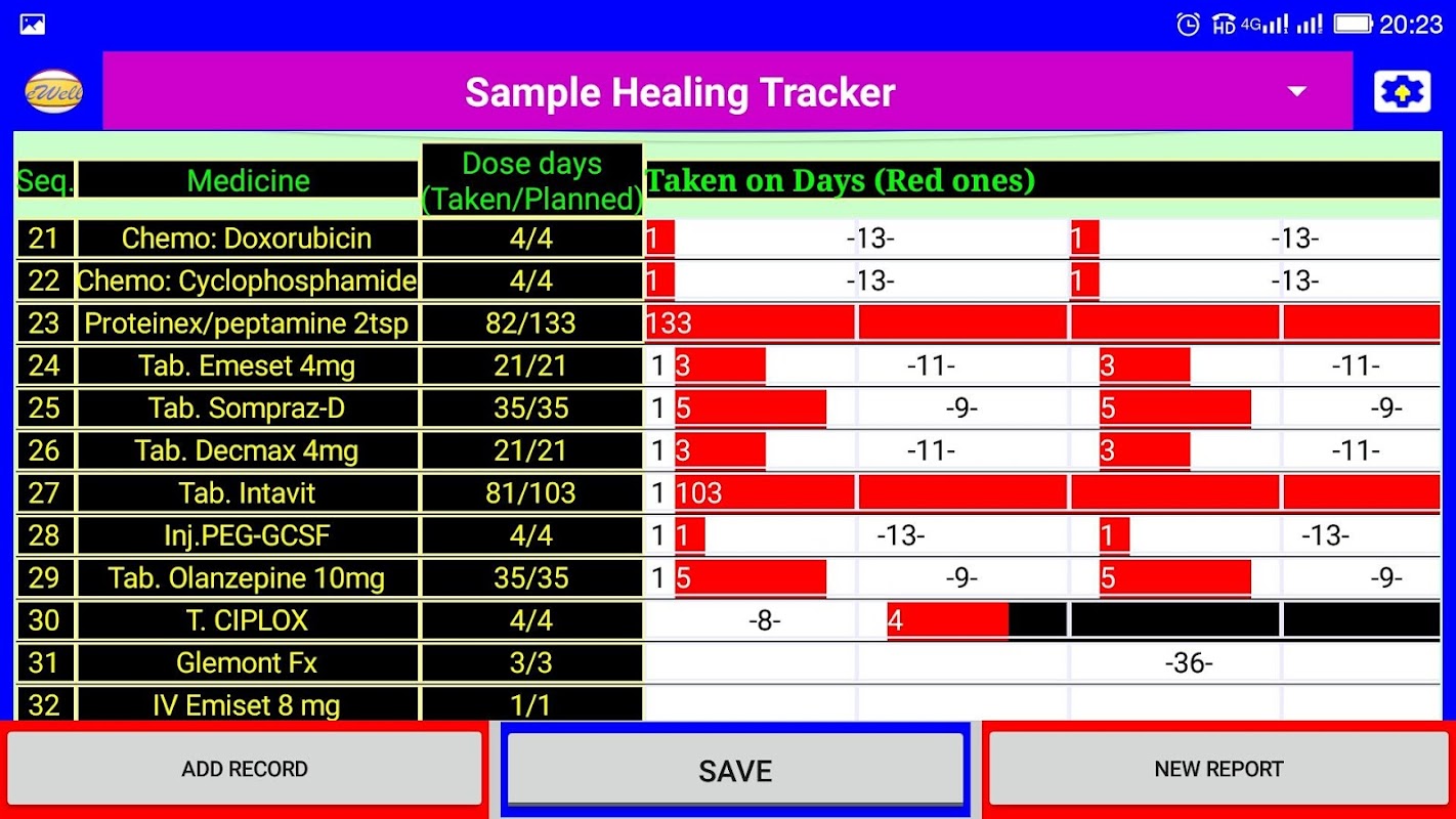 Managing prescriptions/treatment plans - Tracking and reminding medicine/action timings, chart indicating active/inactive days of each medicine with total doses taken and remaining, description and side effect of each medicine etc.