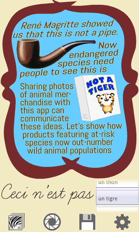 برنامه باغ وحش دیجیتال ما کمک می کند به ذهن شکاف بین حیوانات واقعی و تصاویر حیوانات که بر روی صفحه نمایش، اسباب بازی، مبلمان، کیف، لباس، و حتی مواد غذایی رایج تبدیل شده است. مجهز به برنامه باغ وحش های دیجیتال، حیات وحش جعلی در اطراف شما به سرعت می توانید بخشی از یک تلاش جمعی برای دیدن طبیعت برای آنچه در آن است می شود. توسط مستند فراوانی از حیات وحش، تجاری شما نه تنها به یک مجموعه جام آنلاین اضافه - شما بالا بردن مشخصات تلاش های حفاظت مرتبط. پیدا کردن محصولاتی که استفاده از شبیه حیوانات و اضافه کردن عکس های خود را به آنهایی که ساخته شده توسط دیگر طبیعت دیجیتال است. طریق شبکه های اجتماعی برنامه به شما امکان عکس های خود را، قاب مانند نقاشی های رنگ روغن، به اشتراک گذاری با نوشتن شرح تصاویر مانند "n'est CECI PAS تیگر سازمان ملل متحد." تاریخ سرگرم کننده فرهنگ متراکم، خوراکی عکس از محصولات حیوانی است که در حال تولید مثل سریع تر از عموزاده وحشی است.