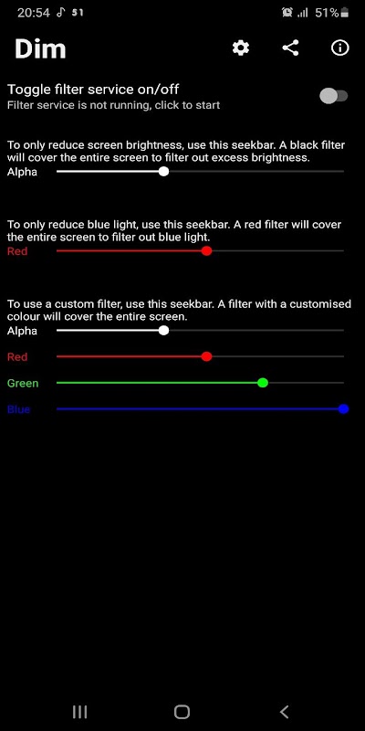 این برنامه را قادر می سازد تا کاربر را به کم نور صفحه نمایش دستگاه خود را در زیر حداقل با استفاده از یک فیلتر سیاه و سفید بیش از کل صفحه نمایش است. همچنین این امکان را به استفاده از یک فیلتر قرمز که فیلترها نور آبی بیش از حد برای استفاده راحت تر از دستگاه خود را در شب. همچنین می توان یک فیلتر سفارشی از هر رنگ با ترکیب سایه های مختلف از رنگ های قرمز، سبز و آبی اعمال می شود. ویجت برای سریع روشن / خاموش روشن نمی از فیلتر اخیرا اعمال شده است.