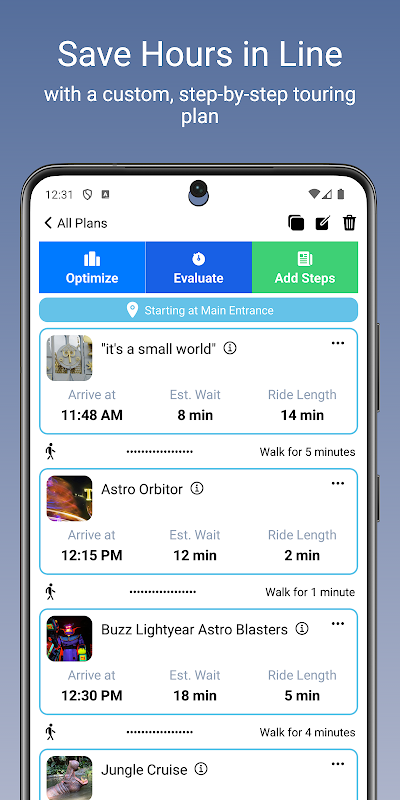گام به گام برنامه تور سفارشی برای هر دو دیزنی لند و دیزنی کالیفرنیا ماجراجویی. شما خطوط که سوار می خواهید برای دیدن بگویید، و خطوط یک برنامه سفر نمایش گام به گام زمانی که برای رفتن به هر کدام سوار برای جلوگیری از صف های طولانی ایجاد کنید. شما حتی می توانید برنامه های خود را تغییر دهید در حالی که شما در پارک هستید!