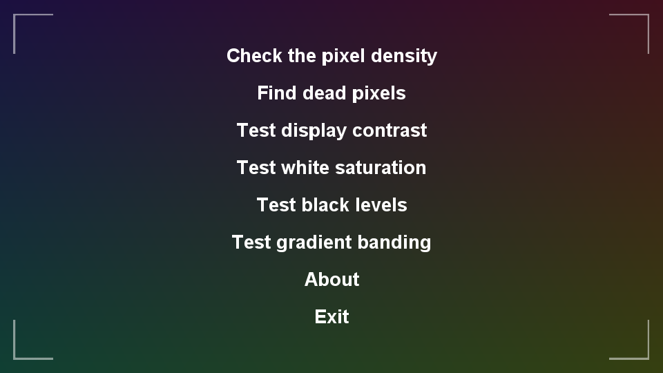 - Test display contrast - This option shows a few scales of linearly increasing RGB values. A good screen should be able to display all of the bands with roughly equal steps in brightness increase.