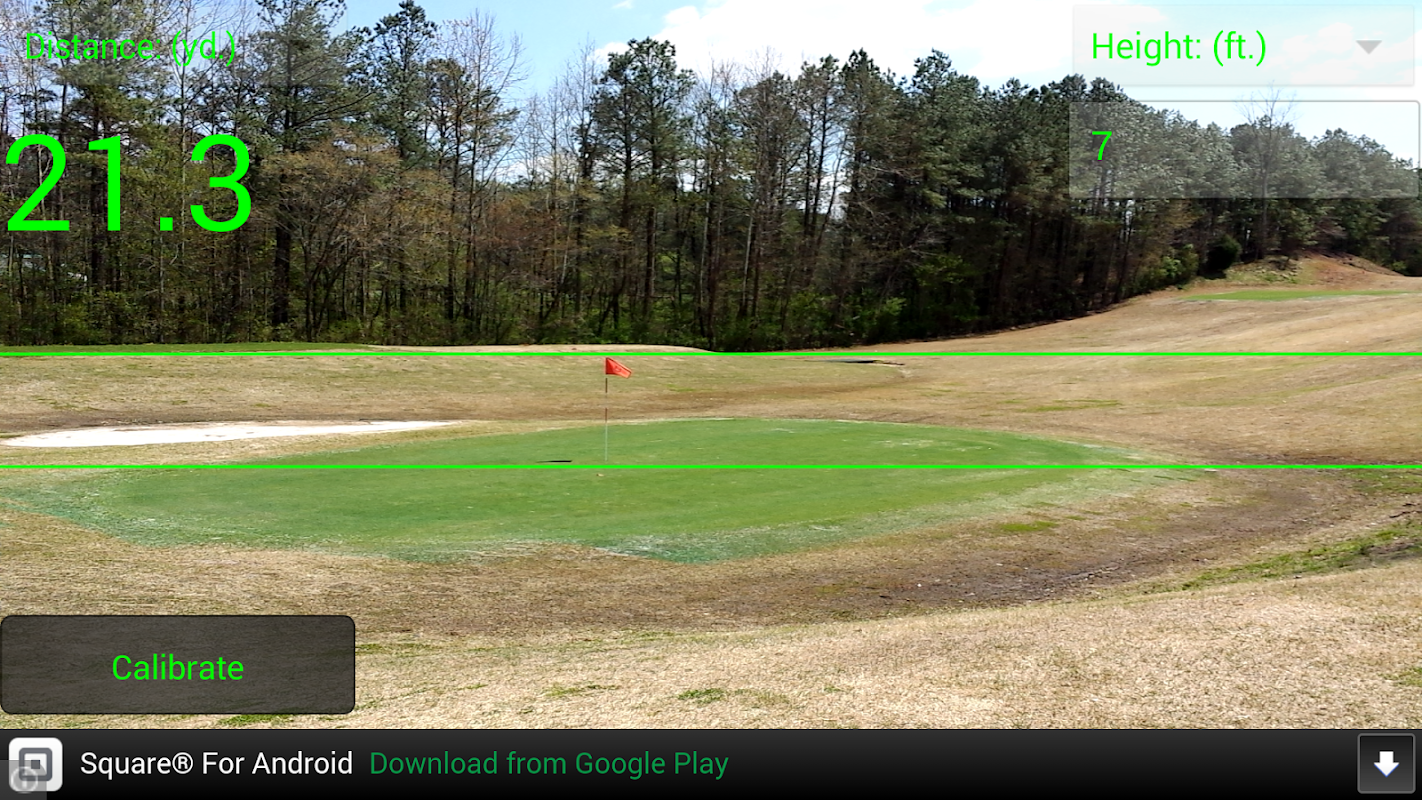 This application turns your Android phone into a range finder, distance finder, and tape measure with no additional attachments needed. This application uses your device's camera to accurately calculate the distances of surrounding objects. This is a great golf range finder or distance measure for golf. The average golf flag is 7 feet tall. So input 7 feet for the height for a golf flag and then place measurement lines on the top and bottom of the flag for an accurate measurement of your distance from the flag :)