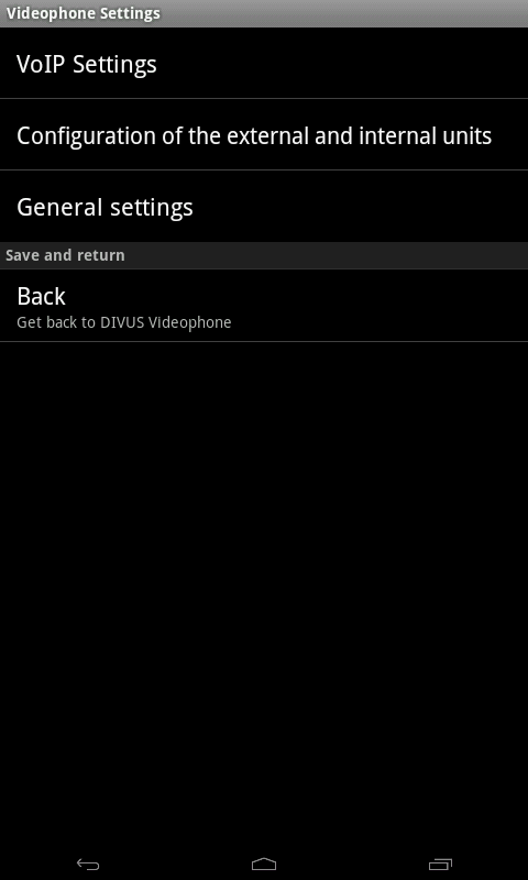 The app DIVUS VIDEOPHONE completes the DIVUS intercom portfolio and makes video communication possible also on DIVUS TZ and other supported devices with Android operating system. The app follows the Windows version of the Videophone-Software as well in functional as in design terms and permits as well to communicate with a connected IP intercom (like e.g. DIVUS OPENDOOR) as also to show the video signal of the external unit.