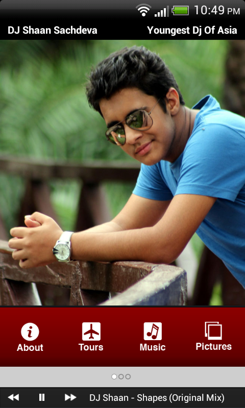 DJ Shaan Official App features tour dates, music, pictures, videos, and fan club links.
