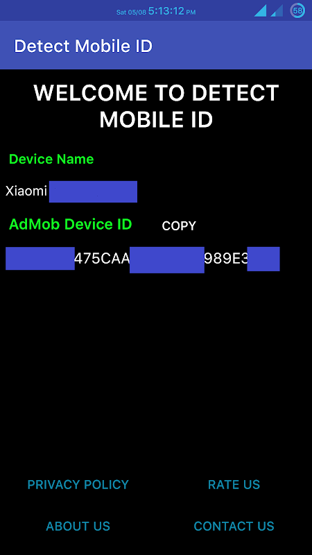 "Detect Mobile ID - Find device ID for AdMob" is an Android App developed by App Droid Developer which you can use for detecting advertising ID by easiest method available for integrating and displaying AdMob testing phase Interstitial and Banner Ad in your app so that you can remove risk of violating AdMob Policy by clicking your own live ads. You can use displayed 30 digit alphanumeric unique AdMob advertising ID in your Android Studio Project for developing purpose by simply copying ID in clipboard and pasting it in your android studio. Your Mobile Unique AdMob ID is displayed in main page of the application.