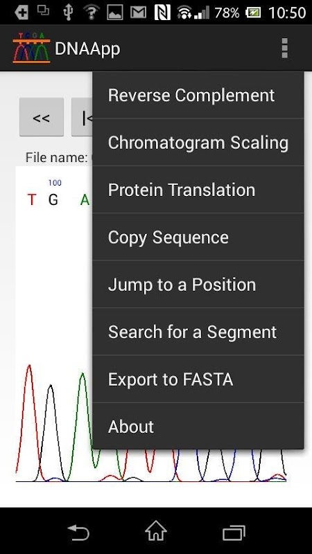 این اولین برنامه آندروید است که اجازه می دهد برای باز کردن و تجزیه و تحلیل فایل های توالی DNA - ab1. این شامل ابزارهای مفید مانند "مکمل معکوس"، "پرش به"، پیمایش سریع و پایانی، "تنظیمات کروماتوگرافی"، ترجمه اسید آمینه، "صادرات به fasta" و "جستجوی بخش".