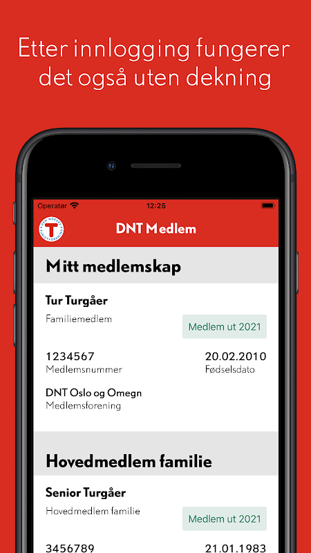 آیا شما عضو انجمن گردشگران نروژ (DNT) هستید؟ سپس می توانید این برنامه را بارگیری کرده و هنگام سفر کارت عضویت دیجیتال خود را با خود ببرید. اعضای خانواده مرتبط با عضویت شما نیز نمایش داده می شوند. بعد از ورود به سیستم ، برنامه بدون پوشش موبایل نیز کار می کند.