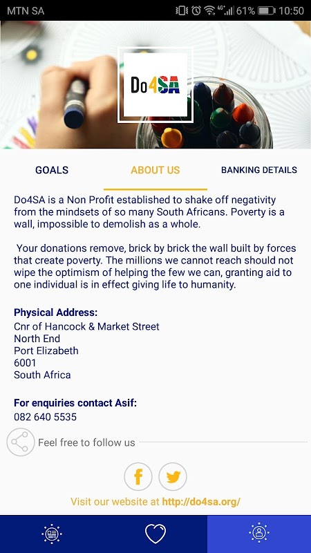 Do4SA سود غیر تاسیس به لرزش منفی از بینش بسیاری از آفریقای جنوبی است. فقر یک دیوار، غیر ممکن است به عنوان یک کل تخریب است. کمک های مالی خود را حذف، آجر به آجر دیوار ساخته شده توسط نیروهای که ایجاد فقر است. میلیون ها نفر ما نمی تواند برسد باید خوش بینی کمک چند ما می توانیم، اعطای کمک های به یک فرد است که در اثر دادن زندگی به بشریت پاک کردن نیست.