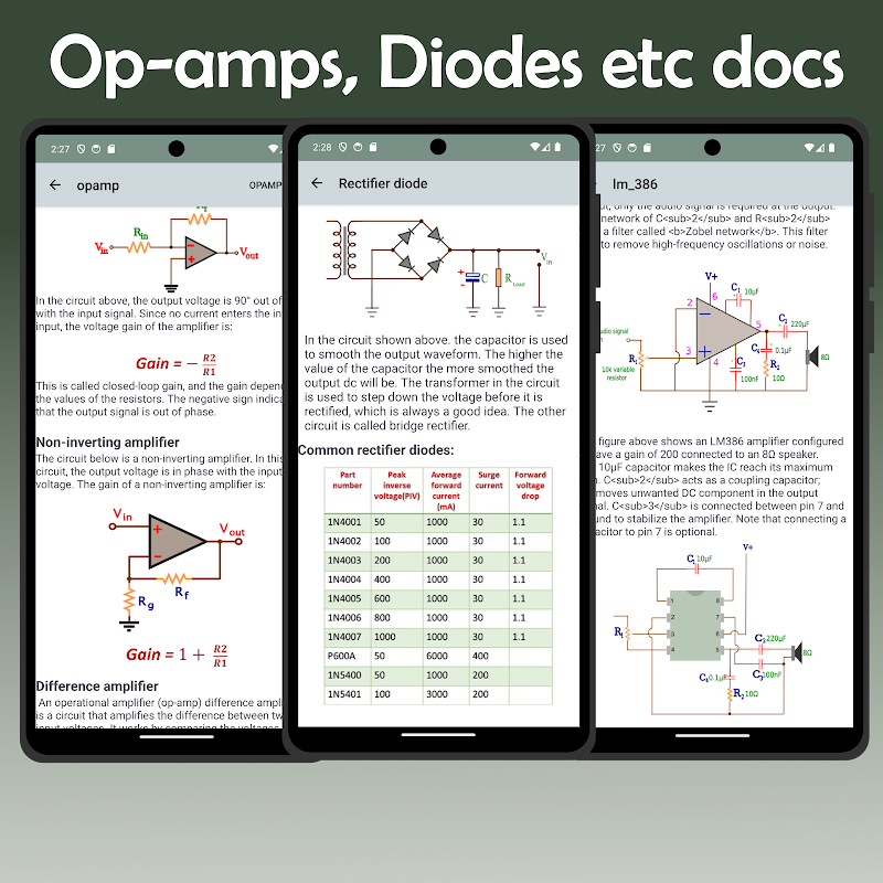 با برنامه جامع ما دنیای الکترونیک را کشف کنید! به توضیحات دقیق قطعات الکترونیکی محبوب از جمله ترانزیستورها، دیودها، خازن ها، فلیپ فلاپ ها، آی سی ها و موارد دیگر دسترسی پیدا کنید. برنامه ما همچنین شامل مجموعه گسترده ای از اسناد مدار الکترونیکی برای درک بهتر است. با استفاده از ابزار ماشین حساب پیشرفته ما که شامل ماشین حساب مقاومت، ماشین حساب طراحی سلف، ماشین حساب طراحی فیلتر، ماشین حساب تایمر 555 و موارد دیگر است، محاسبات مدار را به راحتی حل کنید. طرح های تقویت کننده خود را با ویژگی طرح نقطه ای ساکن تجسم کنید و فیلترهای Butterworth را به راحتی طراحی کنید. چه دانش آموز، سرگرمی یا حرفه ای باشید، برنامه ما ابزاری عالی برای نیازهای الکترونیکی شماست.