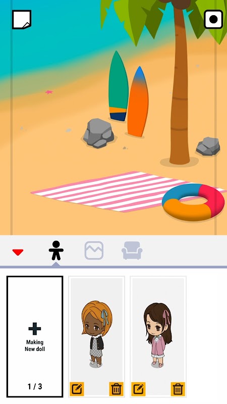 -دکمه پلاس را فشار دهید تا عروسک را با وسایل مختلف تزئین کنید و دکمه مثلث کوچک در انتهای سمت چپ دکمه ضربه بزنید تا کارت عروسک تکمیل شود.