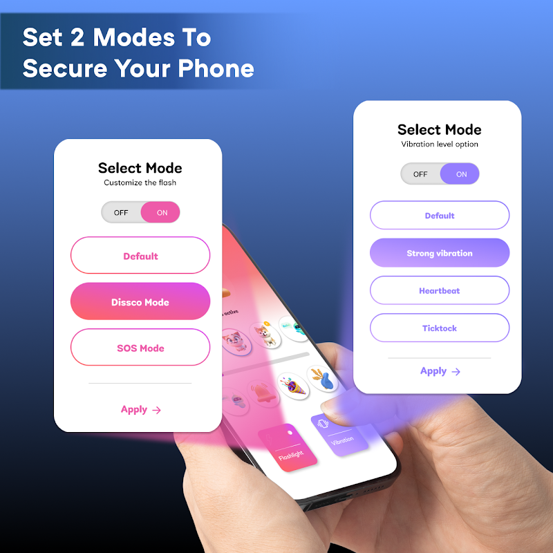 💡سفارشیسازی با هشدار تلفن ضد سرقت آسان شده است - برنامه تلفن من را لمس نکنید. میتوانید میزان صدا، مدت زمان انتشار صدا، گزینههای هشدار فلاش SOS، شدت وزوز تلفن را تنظیم کنید و انتخاب کنید که آیا آهنگ زنگ شامل شود یا خیر. فلاش را می توان برای حالت پیش فرض، حالت دیسکو، حالت هشدار فلاش SOS یا سایر حالت های وزوز مانند پیش فرض، وزوز قوی، ضربان قلب، تیک تاک سفارشی کرد. برنامه هشدار ضد سرقت با استفاده از فناوری آشکارساز ضد جاسوسی به نام هشدار محافظ لمسی، به شما امکان انتخاب های متعدد را بدون رعایت تنظیمات پیش فرض می دهد.