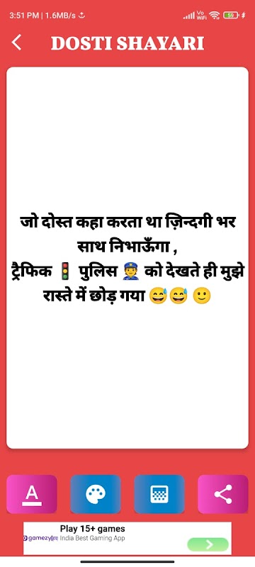 This Dosti and friendship Shayari app is a amazing and great Shayari application having lot of Shayari messages for you with offline to use.also categories as well dosti, veer shayari, hindi friendship shayari,