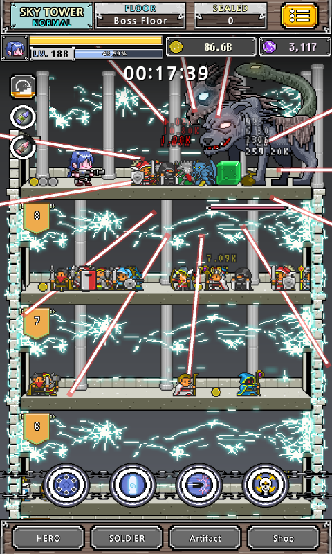 : Normal, Hero, and Legend modes are available. A powerful boss monster waits at the top of each tower.