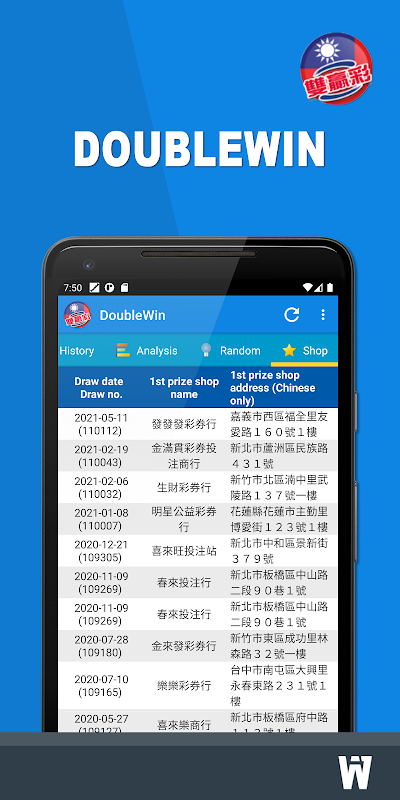 Double Win یک بازی جدید بخت آزمایی در تایوان است که برای شرط بندی باید 12 عدد از اعداد 01 تا 24 را انتخاب کنید. زمانی که قرعه کشی انجام می شود، واحد قرعه کشی به صورت تصادفی 12 عدد را قرعه کشی می کند، این گروه از اعداد، شماره برنده قرعه کشی برد-برد است که به عنوان "شماره برنده" نیز شناخته می شود. اگر همه 12 شماره شما با 12 عدد قرعه کشی شده در دوره فعلی مطابقت داشته باشد یا همه آنها مطابقت نداشته باشند، جایزه اول خواهد بود.