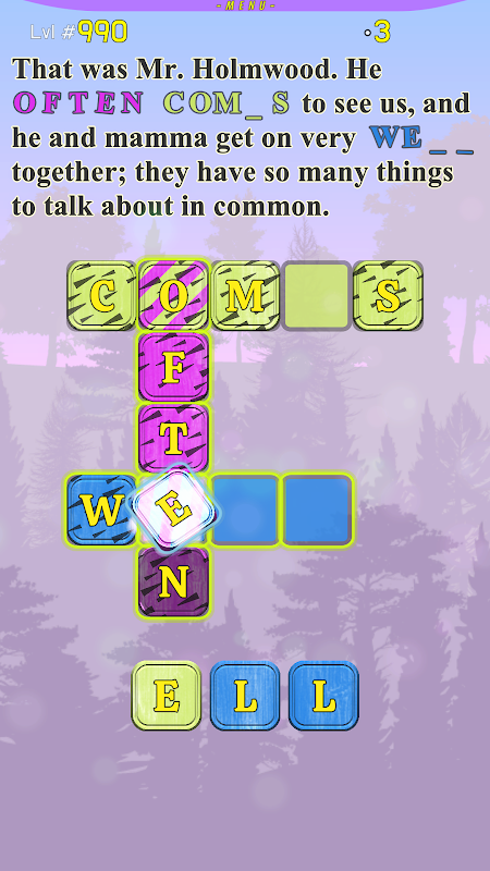 در هر سطح، بخشی از داستان با چند کلمه گمشده به شما ارائه می شود که می توانید با حل جدول کلمات متقاطع زیر متن آن را پر کنید. هر حرفی که پر می کنید در خود متن ظاهر می شود. ما کنترل بازی را بسیار آسان کردیم، فقط به یک لمس روی هر حرف زیر جدول کلمات متقاطع نیاز دارد. همه کلمات در رنگ های منحصر به فرد رنگ آمیزی شده اند. حروف خارج از جدول کلمات متقاطع نیز رنگی هستند، بازیکن باید حروف را با لمس آنها به ترتیب صحیح در کلمات پر کند. هر حرفی که بازیکن لمس میکند، در یک کلمه با همان رنگ به اولین مکان موجود میپرد. اگر حرف در جای اشتباهی باشد، با یک نقطه زرد مشخص می شود که چشمک می زند. بازیکن به راحتی می تواند قرار گرفتن یک حرف را در جای اشتباه تصحیح کند، با لمس آن به بیرون می پرد و سپس بازیکن باید حرف سمت راست متعلق به جای آزاد بعدی را در کلمات لمس کند. حروفی که به دو کلمه تعلق دارند با خطوط مورب با رنگ های هر دو کلمه مشخص می شوند. وقتی کاربر چنین حرفی را لمس می کند، درست به جای درست خود می پرد.