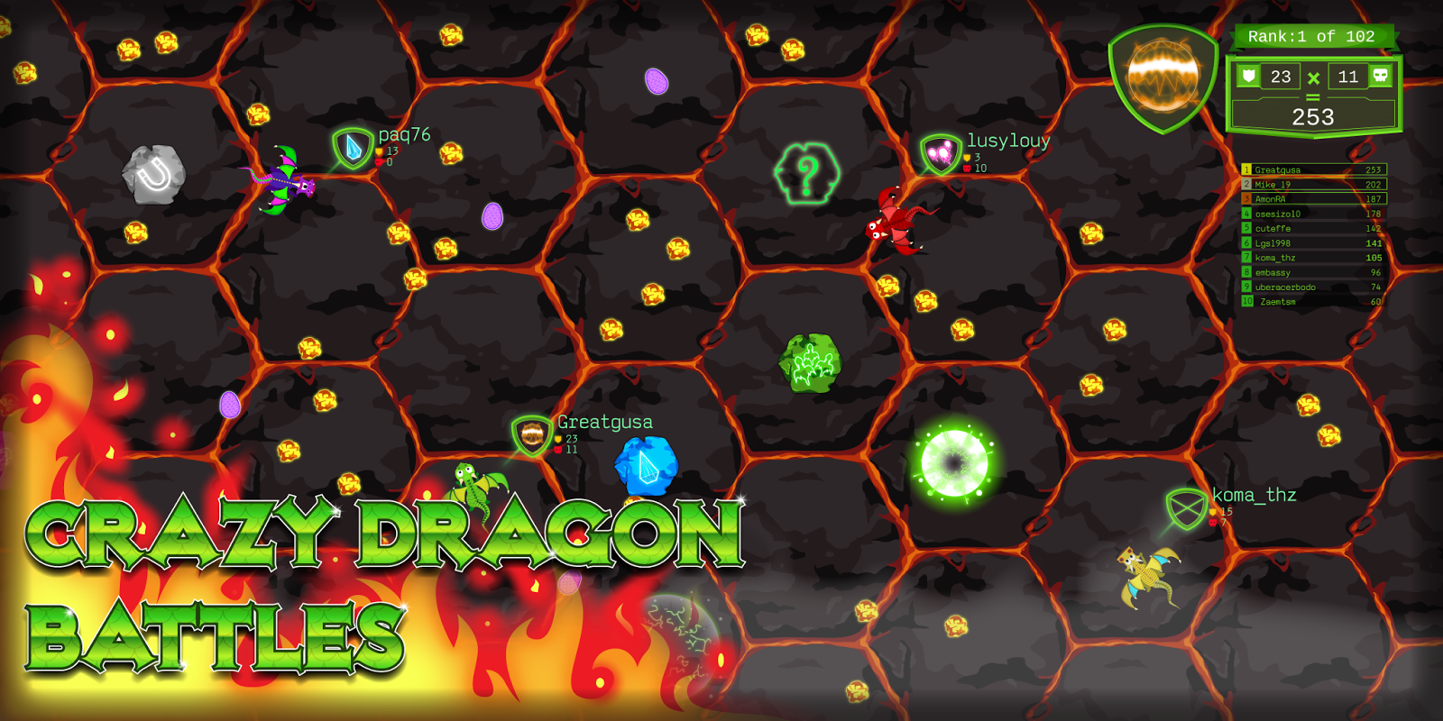 جمع آوری اقلام در اطراف نقشه و استفاده از آنها برای کشتن دیگر بازیکنان. گوی های آتشین، تخم مرغ اژدها، گردباد، امواج گرما ... شما نیاز به استفاده از بسیاری. علاوه بر این، اورژانس، به یاد داشته باشید که شما همیشه می توانید توربو سپر استفاده کنید در ازای آزاد برخی از دانه خود را، که همچنین اجازه خواهد داد