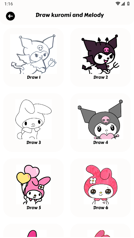 این برنامه دارای طیف گسترده ای از حالت ها و عبارات برای Kuromi و Melody، و همچنین دستورالعمل های گام به گام دقیق در مورد نحوه ترسیم هر شخصیت است. فرآیند ترسیم به شکلها و خطوط ساده تقسیم میشود و پیگیری آن را برای کاربران در تمام سطوح مهارت آسان میکند.