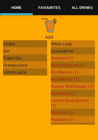 چه این برنامه از دیگران متمایز می کند؟ رویکرد نوآورانه! هنگامی که، در حالی که در یک مهمانی برای مدت زمان طولانی من جستجو در اینترنت دور و گسترده برای نوشیدنی و مواد غذایی در همان زمان چک کردن محتویات میزبان به دنبال. مشکل و غیر عملی است. نوشابه! به نظر می رسد ماده کاملا متفاوت است. فقط از لیست از مواد تشکیل دهنده شما آنهایی که شما را انتخاب کنید و نرم افزار بلافاصله نوشیدنی هایی که شما می توانید انجام پیشنهاد! نه تنها که - نیز به عنوان یک نتیجه شما یک لیست از نوشیدنی، که شما فاقد برخی از اجزای دریافت کنید. راه آسان برای یادگیری است که حتی اگر شما تنها آب قره قاط حال، شما می توانید شب را فتح کند.