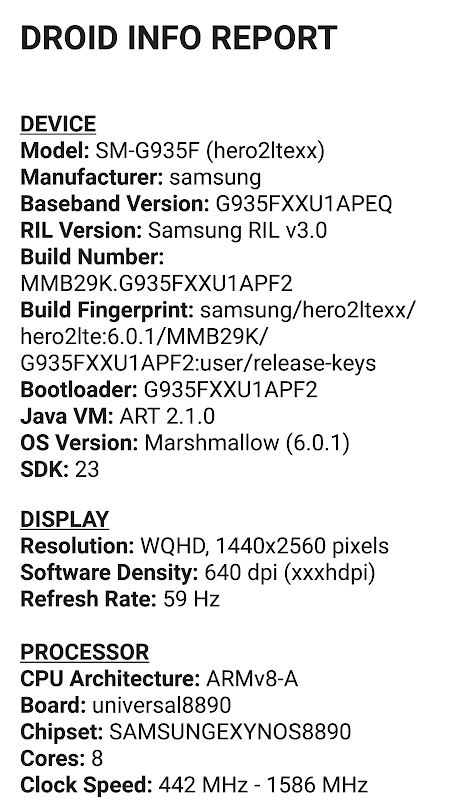 - از دستگاه : مدل، تولید کننده، چیپ ست، ساخت شماره و سیستم عامل آندروید نسخه.