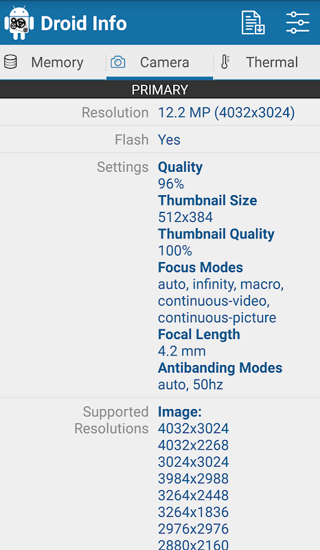 - از دوربین : اطلاعات کامل در مورد دوربین اولیه و ثانویه در گوشی شما. همراه با قطعنامه های پشتیبانی، حالت فوکوس و حالت AntiBanding.