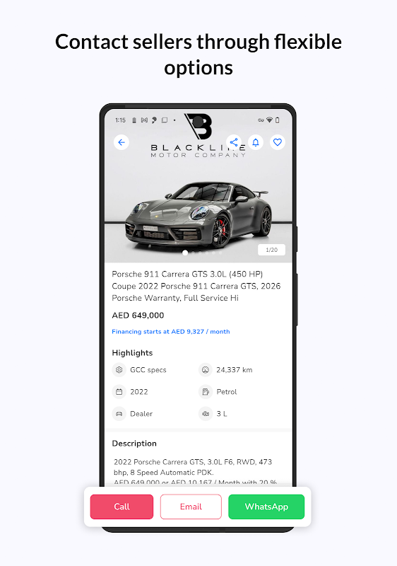 هر لیست خودرو دارای عکس ها و فیلم های HD است. با توضیح دقیق خودرو، کاربران به راحتی می توانند اطلاعات کافی داشته باشند و یک خودروی خاص را در لیست کوتاه قرار دهند. خرید یک ماشین نو یا دست دوم در DubiCars یک فرآیند راحت است. می توان از طریق اپلیکیشن DubiCars از طریق تماس تلفنی، پیامک، ایمیل و حتی واتساپ با فروشنده تماس گرفت.